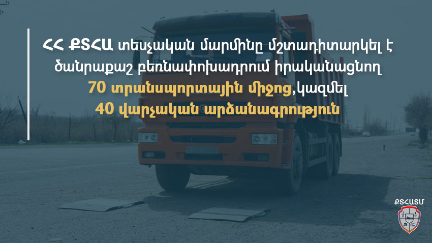 ՀՀ ՔՏՀԱ տեսչական մարմինը շարունակում է միջպետական, հանրապետական նշանակության ավտոճանապարհներով ծանրաքաշ և մեծ եզրաչափերով բեռնափոխադրումներ իրականացնող տրանսպորտային միջոցների նկատմամբ վերահսկողության իրականացումը։ ՔՏՀԱ տեսչական մարմնի տրանսպորտային անվտանգու