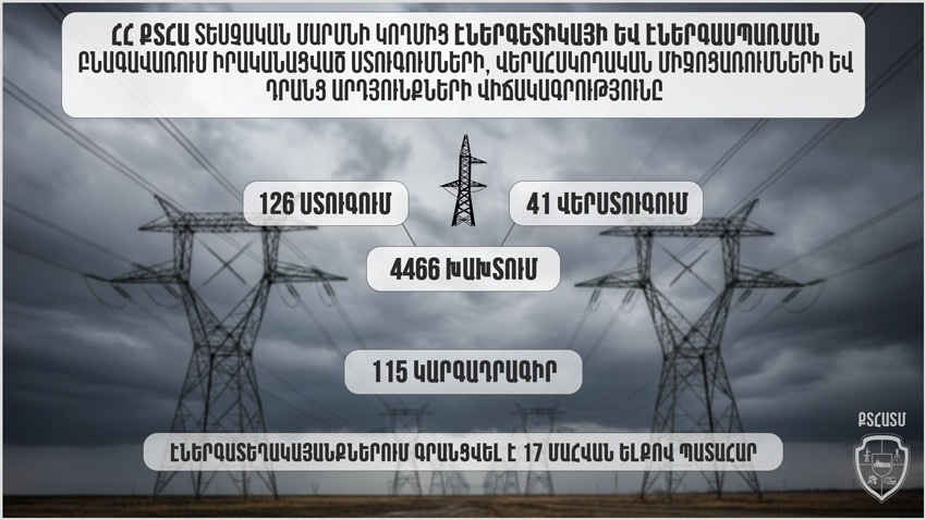 2025 թվականի ստուգումների տարեկան ծրագրով էներգետիկայի և էներգասպառման բնագավառում 117 տնտեսավարող սուբյեկտի մոտ իրականացվել է 125 ստուգում, որից թվով 10 ստուգման արդյունք ամփոփման փուլում է, այդ թվում՝ ԳԱԶՊՐՈՄ ԱՐՄԵՆԻԱ և ՀԱՅԱՍՏԱՆԻ ԷԼԵԿՏՐԱԿԱՆ ՑԱՆՑԵՐ ՓԲ ընկերությունների տարածքային բոլոր 11 մասնաճյուղերում իրականացված ստուգումների։